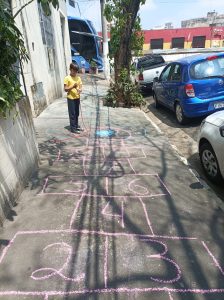 Por isso no dia da criança, as evangelizadoras do CE Vinha de Luz, foram para a rua. Desenharam uma amarelinha na calçada em frente ao centro, levaram corda e convidaram as crianças para a brincadeira. Foi muito divertido!